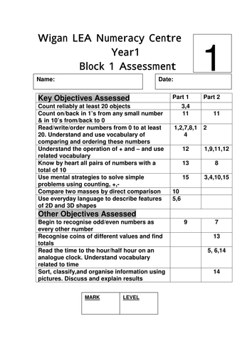 Year 1 Maths Assessment Sheet Teaching Resources