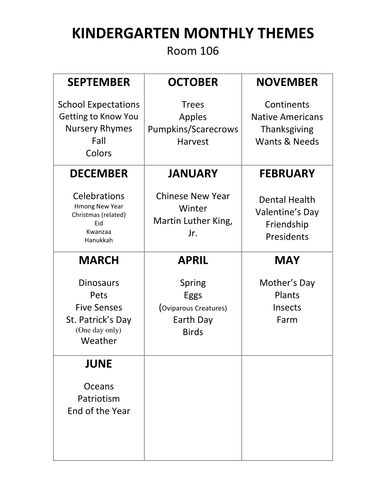 Monthly Themes Of Study Mrs Hackett S Kindergarten