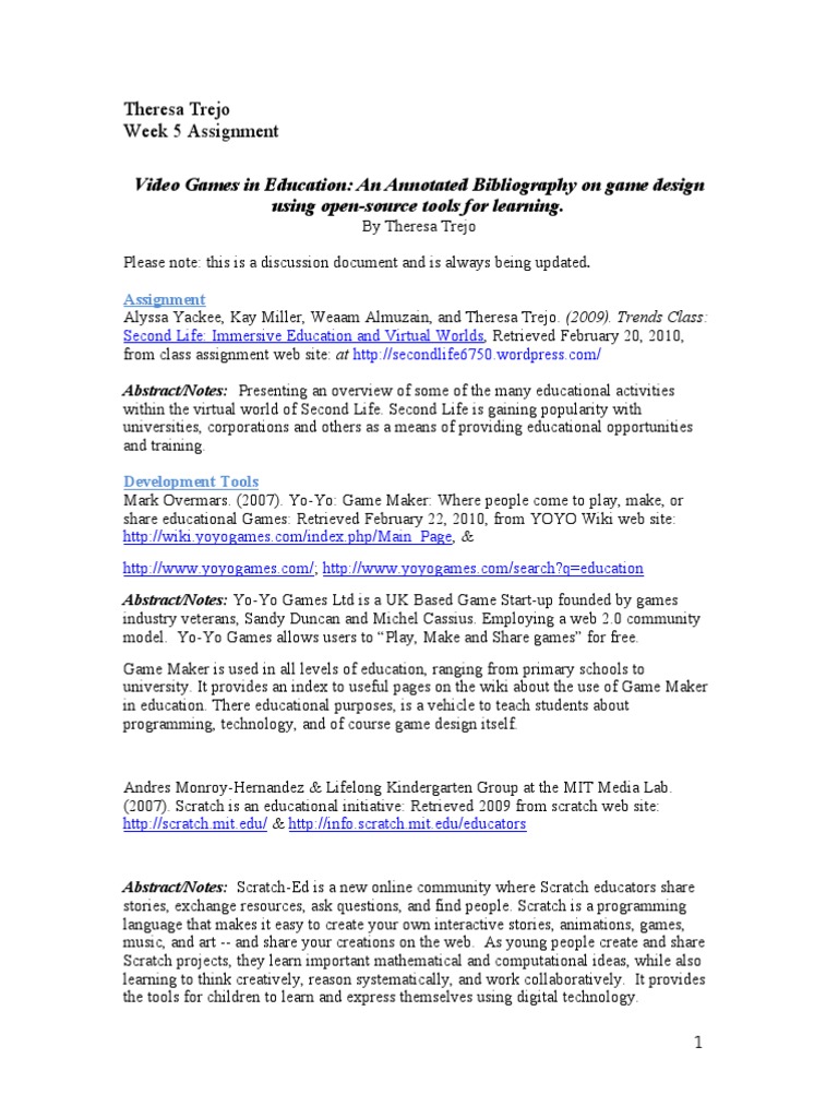 Annotated Bibliography Games In Education Second Life Scratch
